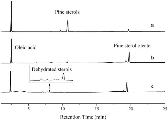 The pine sterols were dehydrated, oxidized and undergo other side reactions at a high temperature. In order to accurately investigate the yield and reaction selectivity of pine sterol esters, this study monitored the yield of pine sterol esters and pine sterol dehydration products. The esterification yield and dehydration sterol yield were calculated by the external standard method with Equations (2) and (3), respectively: