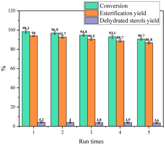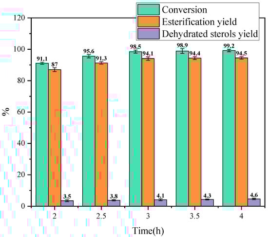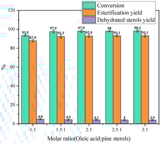 As shown in Figure 2, the molar ratio of oleic acid to pine sterols (1:1–3:1) can significantly affect the yield of products. For instance, when the theoretical value (1:1) was applied, the starting material—pine sterol—cannot be completely converted (93.5%), and the yield of pine sterol esters can only reach 87.9%. Fortunately, when excessive oleic acid was added, the yield of pine sterol esters is significantly increased while the by-product, dehydrated sterol, can also be slightly decreased. This can be attributed to the fact that excessive oleic acid can be used as the reaction solvent to increase the solubility of pine sterols and reduce the viscosity of the reaction system which is conducive to the mass transfer process of the reaction system. In addition, the decrease in dehydrated sterol content is mainly due to the rapid conversion of pine sterols under the high molar ratio of oleic acid and pine sterols, which leads to the low concentration of pine sterols in the reaction mixture to hinder the occurrence of side reactions of sterol dehydration [34]. However, the yield cannot be further improved when the molar ratio of acid to alcohol increased from 1.5:1 to 3:1. Moreover, a large amount of excessive oleic acid will also increase the cost of raw materials and processes. Therefore, the 1.5:1 molar ratio of oleic acid to sterol was selected as the optimal condition.