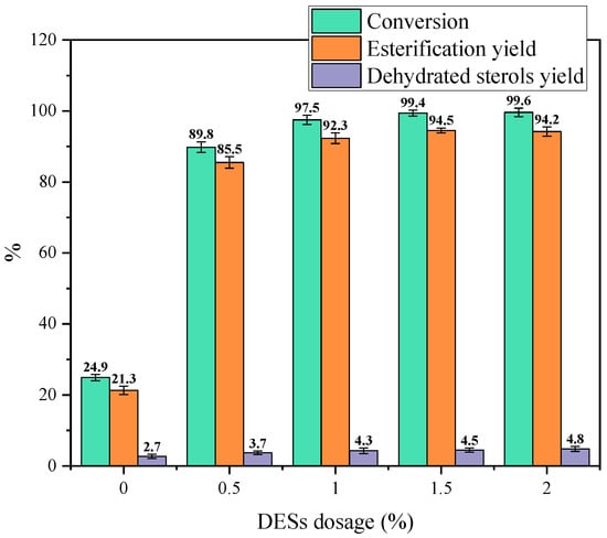 In this study, the effect of DES dosage (0–2%, based on the mass of pine sterols) on the catalytic effect was investigated. As shown in Figure 3, it was observed that the dosage of DES has a significant effect on the esterification effect of pine sterol esters. Compared with the low level of reaction effects without a catalyst (product yield of 21.3%), the yield of pine sterol esters can reach 85.5% when adding 0.5% DES, indicating that the reaction effect can be significantly improved when adding a small dosage of DES catalyst. With the increase in DES dosage, pine sterols gradually tend to be completely transformed, and the yield of sterol esters reached the highest value when 1.5% DES was added. Next, the yield of sterol esters began to decrease slightly, and the yield of dehydrated sterol continued to increase when the dosage of DES was further increased, which indicated that the excessive dosage of DES catalyst was detrimental to the selectivity of the reaction (this phenomenon can be observed in the catalyst screening experiment). In addition, the lower catalyst dosage will help to reduce the production cost and product safety of sterol esters. Herein, 1.5% DES was used for the esterification of pine sterol esters.