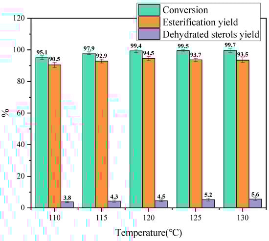 The high temperature can increase the solubility of pine sterols and reduce the mass transfer resistance of the reaction system, which is favorable to the esterification reaction; however, a temperature that is too high is also prone to side reactions, so the appropriate temperature is very important for the synthesis of pine sterol esters. As shown in Figure 4, the effects of temperature on the reactions were investigated. As shown in Figure 4, the conversion and sterol esters yield were above 90% in all selected temperatures, and the highest yield (94.5%) was obtained at 120 °C. In addition, it can be observed that a high reaction temperature is also conducive to the production of dehydrated sterols. These results are in agreement with those of previous studies. Finally, 120 °C was selected for the following experiment.