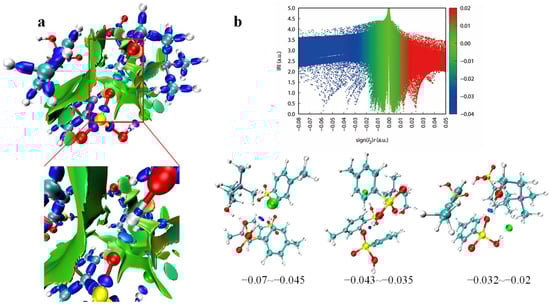 The independent gradient model based on the Hirshfeld partition (a), and NCI analysis of ChCl/PTSA (1:3) DES (b). The color from green to blue indicates the H-bonds moving from weak to strong.