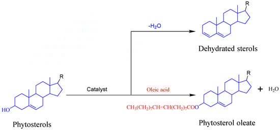 The pathway of the esterification of phytosterols is displayed in Scheme 1. The main competitive reaction of this process is the dehydration of sterols at high temperatures [13]. At present, the main methods to synthesize fatty acid esters of phytosterols are chemical and enzymatic. Although the enzymatic synthesis of phytosterol fatty acid esters has the advantages of mild conditions and green environmental protection, its industrial application is limited by low efficiency and high cost [14,15,16,17]. Therefore, chemical synthesis is still the most widely used method for the preparation of phytosterol esters. Many researchers are committed to developing different catalysts to improve the yield of phytosterol esters and the selectivity of esterification, such as potassium bisulfate [18], sulfuric acid [19], MgO [20] and acidic ionic liquids [13,21,22]. Although these existing chemical catalysts have advantages in terms of their reaction speed or yield, they are still plagued by corrosive equipment, low reaction selectivity, high energy consumption and environmental pollution. Most of these catalysts can only be used at a high temperature, which will produce a large amount of dehydration by-products and limits their applications in foods [13,23]. Moreover, the removal of solvents and catalysts is also a major barrier preventing their industrial applications [24].