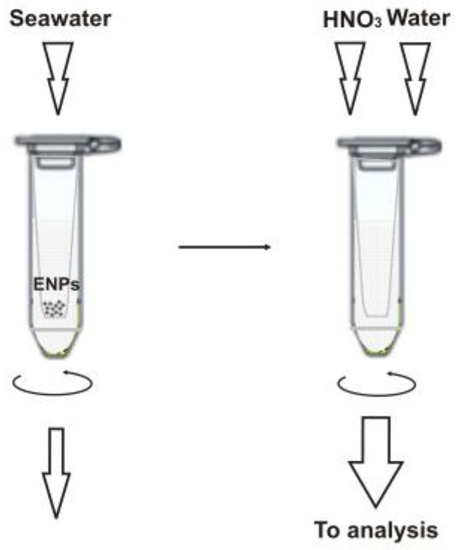 A schematic illustration of the sample preparation workflow is given in Figure 1 and detailed in the Materials and Methods section below. It is important to note that we used ultrafiltration to separate the ENPs from bulk seawater samples so that the retained particles are then brought into solution after dissolution directly in the filtration unit and analyzed as the respective metal ions [11]. This approach allows for easy discrimination of signals from nanoparticulate matter and an ionic background. Previously, it was shown that commercial membrane filters prove useful for nanoparticle separation [11,12,13], and the 3 kDa filter units seem to be preferable than other molecular mass cut-offs [11,14,15] (at least for the particles larger than 10 nm in diameter). However, it is essential to precondition the filter membrane, e.g., with 0.1 M copper nitrate [11,13], to avoid ionic metal adsorption. Since such treatment might compromise the determination of copper-based NPs, we prefer a nickel nitrate solution in this case. It should be noted that copper-containing nanomaterials find more common industrial use and are expected to occur in seawater at higher concentrations than Ni-NPs (see also Section 2.3). The fact that nickel nitrate can well substitute Cu(NO3)2 was verified experimentally, and the comparative recovery data for the test ENPs are shown in Table 2.