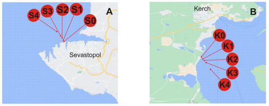 Location of sampling sites across the Black Sea. Sampling stations legend: (A) S0, S1, S2, S3, and S4 from the Sevastopol City area are taken at the same distances from the coast. (B) K0, K1, K2, K3, and K4 from Kerch Bay at a distance of ~5, 100, 200, 500, and 2000 m from the coast, respectively.