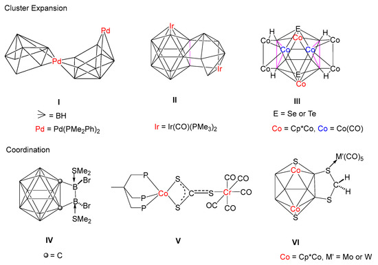 - Grimes, R.N. Cluster forming and cage fusion in metallacarborane chemistry. Coord. Chem. Rev. 1995, 143, 71–96. [Google Scholar] [CrossRef]