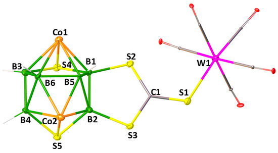 Spectroscopic data of 4: MS (ESI+): calcd for [C26H34B6Co2O5S5W]+: m/z 953.9741, found: 953.9784; 11B{1H} NMR (160 MHz, CDCl3, 22 °C): δ (ppm) = 24.6 (br, 2B), 26.4 (br, 1B), 33.4 (br, 2B), 38.2 (br, 1B); 1H NMR (500 MHz, CDCl3, 22 °C): δ (ppm)= 1.69 (s, 15H; 1×Cp*); 1H{11B} NMR (500 MHz, CDCl3, 22 °C):3.49 (br, 1H, BHt), 3.75 (s, 2H, BHt), 4.03 (s, 1H, BHt); IR (dichloromethane, cm−1): ῡ = 2477 (B-Ht), and 1923 (terminal CO).