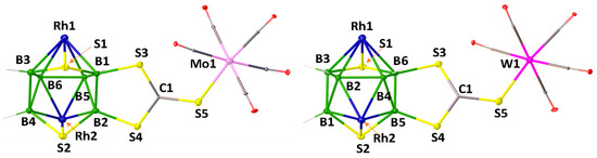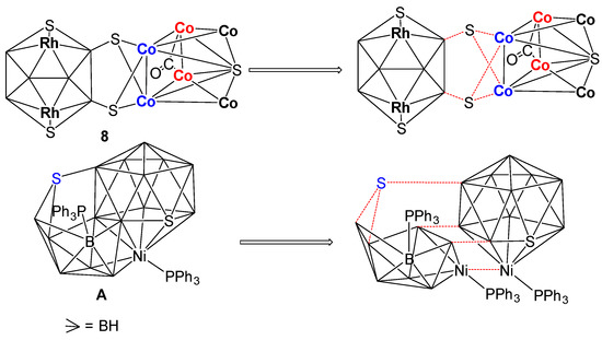 The structural account of 8 can also be described in a different approach. As shown in Figure 7, this may be considered as two intercluster crosslinks, in which two sulfur atoms (S3 and S4) are bridged by two Co1 and Co2 atoms of the bicapped square pyramidal {Co6S} and two boron atoms (B4 and B6) on the 10-vertex nido-{Rh2B6S2} subcluster in µ3-fashion. A similar description has also been proposed for [(PPh3)NiS2B16H12(PPh3)] by Kennedy [55]. As shown in Figure 7, in case of A, there is an intercluster crosslink in which a sulfur atom bridges two boron atoms of the 9-vertex nido-{NiB8} subcluster and a boron atom on the 12-vertex closo-{NiSB10} subcluster in µ3 fashion.