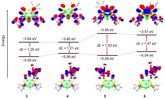 Comparison of frontier molecular orbitals of 3, 4, 5 and 6; respectively. Contour values for isosurface are ±0.04 (e/bohr3)1/2.