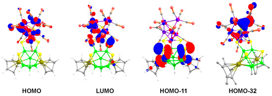 As shown in Figure 8, the MO analysis of cluster 8 reveals that the HOMO consists of mainly the d orbitals of cobalt atoms of {Co6S} core, whereas the non-bonding p-orbitals of the wingtip S3 and S4 atoms of the butterfly {Co2S2} contribute to the LUMO. The HOMO-11 displays an antibonding interaction between Rh1 and S1 as well as Rh2 and S2, that make the Rh1-S1 and Rh2-S2 bonds susceptible for nucleophilic attack. On the other hand, the HOMO-32 reveals conjugated π-interactions in both Co2-Co5-Co7 and Co1-Co5-Co6 planes of the bicapped square pyramidal {Co6S} unit (Figure 8). This leads us to presume that these two planes are prone to electrophilic substitution. In addition, HOMO-35 displays orbital overlap between two cobalt atoms and two sulfur atoms of the {Co2S2} butterfly fragment (Figure S24 in Supplementary Materials).