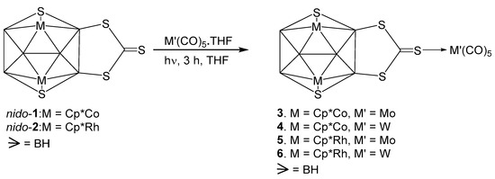 2.1. Reactivity of nido-1 and nido-2 with M’(CO)5.THF (M = Mo, W)