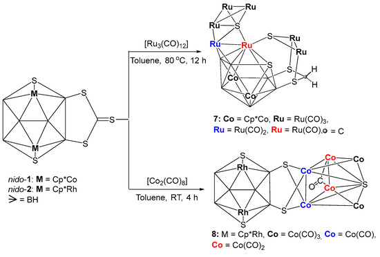 2.2. Condensed Clusters: [{Ru(CO)3}3S{Ru(CO)}{Ru(CO)2}Co2B6SH4{Ru(CO)3}2(SCH2S2)], 7 and [(Cp*Rh)2B6H4S4{Co(CO)}2{Co(CO)2}2(μ-CO)S{Co(CO)3}2], 8