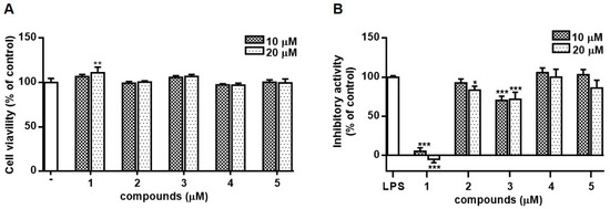 Based on the finding that the methanolic extract of S. brachyotus effectively reduced the production of nitric oxide (NO) in lipopolysaccharide (LPS)-activated RAW264.7, the anti-inflammatory activities of the isolated compounds 1–5 were evaluated in the same in vitro system. Prior to screening the activities of 1–5, their cytotoxicity was measured using the MTT assay (Figure 3). Compounds 1–5 showed no cytotoxicity at the concentrations tested (10 and 20 µM), while the treatment of RAW264.7 cells with 1 resulted in the increased cell viability at a concentration of 20 µM (Figure 3A). To evaluate the inhibitory activities of 1–5 on NO production, RAW264.7 cells were treated with each compound (10 μM) for 1 h and, then, treated with LPS (100 ng/mL). After 24 h of incubation, the level of NO in the culture medium was detected using Griess reagent. It was observed that the content of NO induced by LPS decreased in cells treated with 1, 2, or 4. The treatment of cells with 1 led to a significant decrease in NO production (Figure 3B).