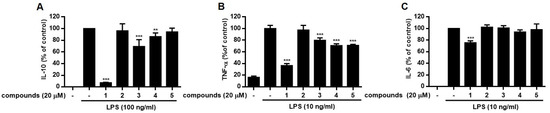 Effects of compounds 1−5 isolated from S. brachyotus on IL-10 (A), TNF-α (B), and IL-6 (C) production in LPS-stimulated RAW264.7 cells. The cells were treated with each compound (20 μM) for 1 h before exposure to 10 ng/mL (TNF-α, IL-6) or 100 ng/mL (IL-10) of LPS. After incubation for 3 h (TNF-α), 6 h (IL-6), and 18 h (IL-10), the levels of IL-10, TNF-α, and IL-6 in the culture medium were subsequently measured using commercially available ELISA kits. Results are presented as the mean ± standard deviation from three independent experiments. The results differ significantly from LPS-only treated; ** p < 0.01, *** p < 0.001.