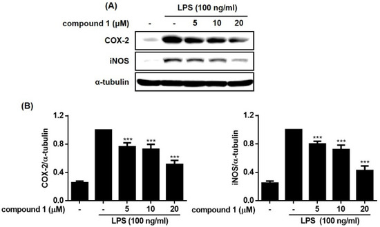 Compound 1 down-regulated the expression of inducible nitric oxide synthase (iNOS) and cyclooxygenase 2 (COX-2) in RAW264.7 cells stimulated with LPS. The RAW264.7 cells were pretreated with the compound (5, 10, and 20 μM) for 1h before exposure to LPS for 24 h. The representative blots (A) and the calculated intensities (B) after normalization to α-tubulin were presented. Results are presented as the mean ± standard deviation from three independent experiments. The results differ significantly from LPS-only treated; *** p < 0.001.