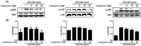 Compound 1 attenuated the phosphorylation of mitogen-activated protein kinase (MAPK) family in RAW264.7cells. The RAW264.7 cells were pretreated with the compound (5, 10, and 20 μM) for 1 h before exposure to LPS for 24 h. The phosphorylated MAPKs (JNK, ERK, and p38) were analyzed using Western blotting. The representative blots (A) and the calculated intensities after normalization to α-tubulin (B) were presented. Results are presented as the mean ± standard deviation from three independent experiments. The results differ significantly from LPS-only treated; * p < 0.05, *** p < 0.001.