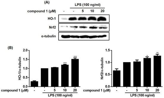 Effects of compound 1 on Nrf2/HO-1 pathway in LPS-induced RAW264.7 cells. The RAW264.7 cells were pretreated with the compound (5, 10, and 20 μM) for 1h before exposure to LPS for 24 h. The representative blots (A) and the calculated intensities after normalization to α-tubulin (B) were presented. Results are presented as the mean ± standard deviation from three independent experiments. The results differ significantly from LPS-only treated; * p < 0.05, ** p < 0.01, and *** p < 0.001.