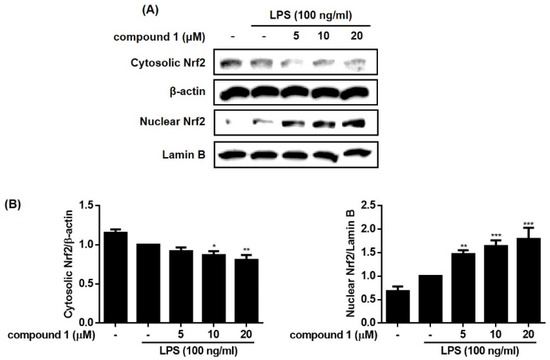 Effects of compound 1 on Nrf2 protein expression in RAW264.7cells. The RAW264.7 cells were pretreated with the compound (5, 10, and 20 μM) for 1h before exposure to LPS for 24 h. Protein samples for nuclear and cytosol extract of RAW264.7 cells were analyzed by Western blot using anti-Nrf2 antibody. The representative blots (A) and the calculated intensities (B) after normalization to Lamin B (nucleus) or β-actin (cytosol) were presented. Results are presented as the mean ± standard deviation from three independent experiments. The results differ significantly from LPS-only treated; * p < 0.05, ** p < 0.01, and *** p < 0.001.