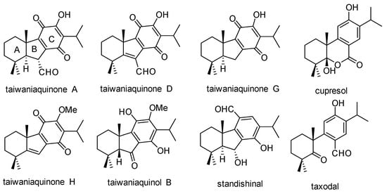 Taiwaniaquinoids belong to a group of terpenoids with an unusually rearranged 5(6→7) or 6-nor-5(6→7)abeo-abietane skeleton, which have been isolated from species of East Asian conifers during the last 20 years [1]. Although little is known about their biological activities, preliminary studies have revealed some interesting properties, including cytotoxic and trypanocidal effects [2,3,4,5,6,7]. The other structurally related compounds are the bioactive seco-taiwaniquinoids cupresol [8] and taxodal [9]. Figure 1 shows some representative examples of this type of compound.