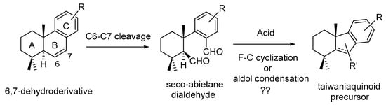 Continuing our research on the synthesis of taiwaniaquinoids from abietane diter-penes, and the related biosynthetic pathway, and after our unsuccessful attempt to achieve the B ring contraction via pinacol rearrangement [30], we focused on the trans-formation of 6,7-dehydroabietane derivatives, which are similar to compound 1, into taiwaniaquinoids. Thus, we considered the oxidative degradation of the C6–C7 double bond and the subsequent acid-mediated cyclization of the resulting seco-abietane dialdehyde, through a Friedel–Crafts-type reaction process, as reported by Node [32], or via an intramolecular aldol condensation, providing the desired B ring contraction (Scheme 1).