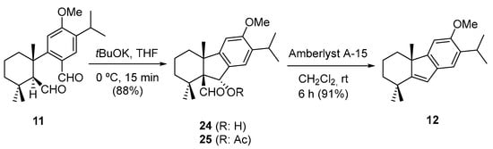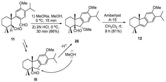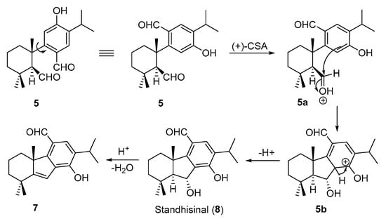 In a previous study by Node et al. [32], the seco-abietane dialdehyde resulting from the reductive ozonolysis of the 6,7-dehydroderivative was isolated and, after the deprotection of the phenolic hydroxyl group, was subjected to acid treatment, affording standishinal as the sole product; this compound results from a Friedel–Crafts-type cyclization, which is probably due to the activation of the aromatic ring by the hydroxyl group. Several Brønsted and Lewis acids were assayed, and (+)-camphorsulfonic acid was found to provide the best results [32].