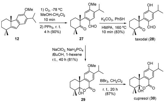 The treatment of ketoaldehyde 27, resulting from the ozonolysis of ether 12, with ti-ophenol in basic media, gave bioactive taxodal (28) [37]. Alternatively, the oxidation of compound 27 with sodium chlorite produced a 1:1 mixture of epimers 29. The deprotection of methyl ether and further chromatography allowed us to obtain the enantiopure bioactive cupresol (30) [37,38].
