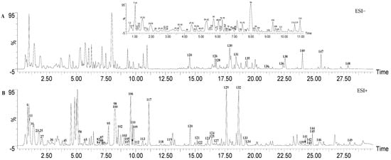 The base peak intensity (BPI) chromatograms of the SP 75% ethanol extract are shown in Figure 1. A total of 149 components were identified or tentatively identified (Table 1). Among them, 35 components were identified through a comparison with the reference substances, while other components were preliminarily identified through accurate molecular weight and typical mass fragment analysis. It is also worth mentioning that 139 of the 149 components were identified from SP for the first time. The identification of these phytochemicals highlights the structural diversity of secondary metabolites in SP.