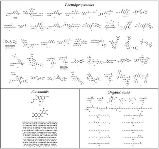 According to the types of chemical structure, these identified compounds could be divided into phenylpropanoids, flavonoids, terpenoids, organic acids and other types. The structures are listed in Figure 2.