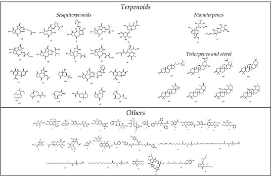 - Menichini, F.; Di Benedetto, R.; Delle Monache, F. A triterpene epoxide and a guaianolide from Ptilostemmon gnaphaloides. Phytochemistry 1996, 41, 1377–1379. [Google Scholar] [CrossRef]