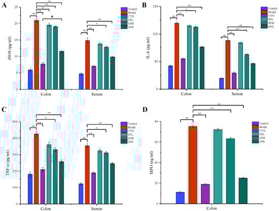 As shown in Figure 4, the levels of TNF-α, IL-6 and iNOS in the serum or colon, and the level of MPO in the colon, were all considerably higher in the model group compared to the control group. While being treated with CYN and SP, the levels of the above cytokines all significantly decreased compared with the model group. In addition, in terms of modulating TNF-α and MPO, the SP at a high dose showed similar effects to CYN, the positive control drug.