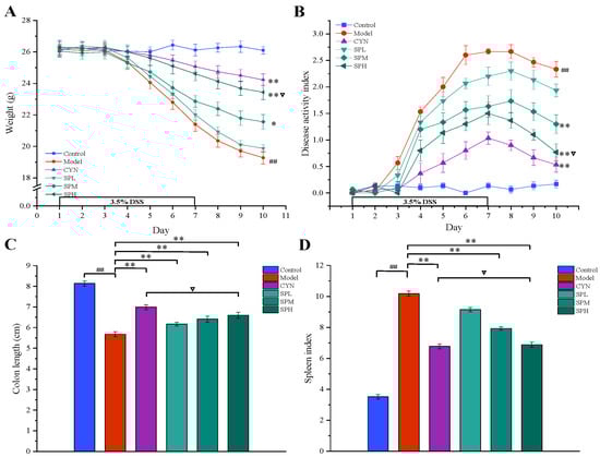Effect of SP on (A) body weight, (B) disease activity index, (C) colon length and (D) spleen coefficient. (Data are expressed as the means ± S.E.M., n = 10). Compared with control group, ## p < 0.01; compared with model group, * p < 0.05, ** p < 0.01; compared with CYN group, ∇ p > 0.05).