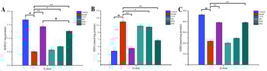 Effect of SP on (A) SOD, (B) MDA and (C) GSH. (Data are expressed as the means ± S.E.M., n = 10). Compared with control group, ## p < 0.01; compared with model group, * p < 0.05, ** p < 0.01; compared with CYN group, ∇ p > 0.05).