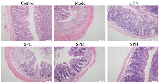 As shown in Figure 3C, the colon of the model group mice was significantly shorter than that of the control group, indicating that the colon tissue had been damaged (p < 0.01). Colon damage could be reduced with the oral administration of SP or CYN. Compared to the model group, a significant increase (p < 0.01) in colon length was observed in the CYN, SPM and SPH groups, and high doses of SP provided a similar effect to CYN (p > 0.05). Compared to the control group, the spleen coefficient increased significantly in the model group, indicating that the UC mice exhibited inflammatory responses. In contrast, after CYN or three dosages of SP, the spleen coefficients were significantly decreased (p < 0.01). The above results are shown in Figure 3D. The above results showed that both SP and the positive drug could decrease the inflammatory responses in UC mice.
