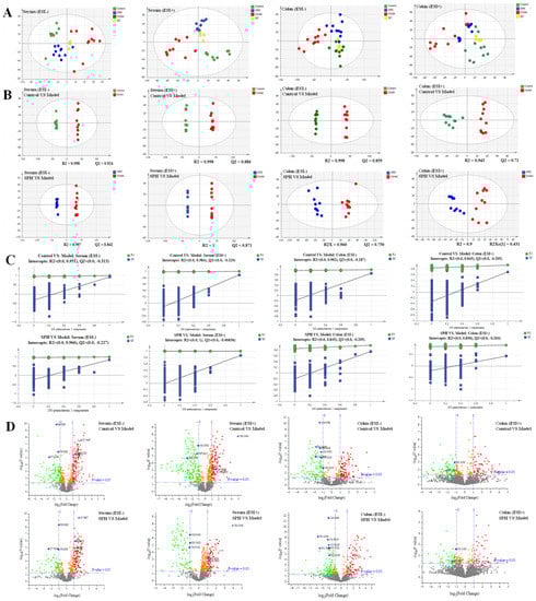 The PCA score (A), OPLS-DA score (B), permutations test (C) and volcano plots (D) of serum and colon metabolic profiling.