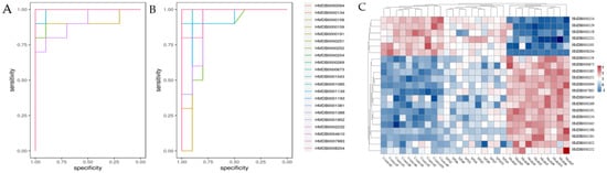 The predictive receiver operating characteristic (ROC) curves (A: between control group and model group, B: between model group and SPH group) and the heatmap (C) of the identified potential biomarkers in each group.