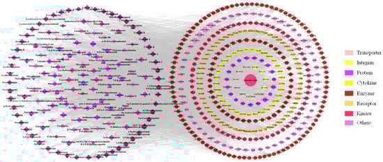 Next, the interactions of 149 compounds on 373 core targets were examined, and the SP-core targets network was built, as shown in Figure 10, which illustrated a network with 535 nodes and 11,387 edges. On one hand, 116 of the components’ degrees were greater than the average degree, which is 65. Among these 116 components, there were 17 components that had been quantified determined. On the other hand, the degrees of the phenylpropanoids and flavonoids, being 75 and 74, respectively, were greater than the other structure type’s component degrees.
