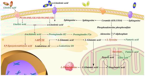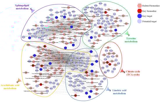 The integrated analysis was performed based on the 373 potential targets obtained from the network pharmacology and the 21 potential biomarkers identified from the metabolomics in order to further confirm the key targets, biomarkers and pathways. The “biomarkers-targets-pathways” network was then constructed (Figure 11). Through matching analysis, there were ten biomarkers (succinate, L-phenylalanine, L-tyrosine, fumarate, PC(18:3/18:2), citrate, arachidonate, linoleic acid, 5(S)-HpETE, 8,9-EET), 18 targets (ADH1B, AKR1C1, ALDH2, ALOX5, CBR1, COMT, CYP1A1, CYP1A2, CYP1B1, DBH, EPHX1, GSTP1, HSD11B2, MIF, MPO, PNMT, PTGS1, PTGS2) and five pathways (arachidonic acid metabolism, citrate cycle, linoleic acid metabolism, sphingolipid metabolism and tyrosine metabolism) that were closely connected in the constructed network. In addition, the metabolic network, including these ten key biomarkers and their metabolic sites, is shown in Figure 12.