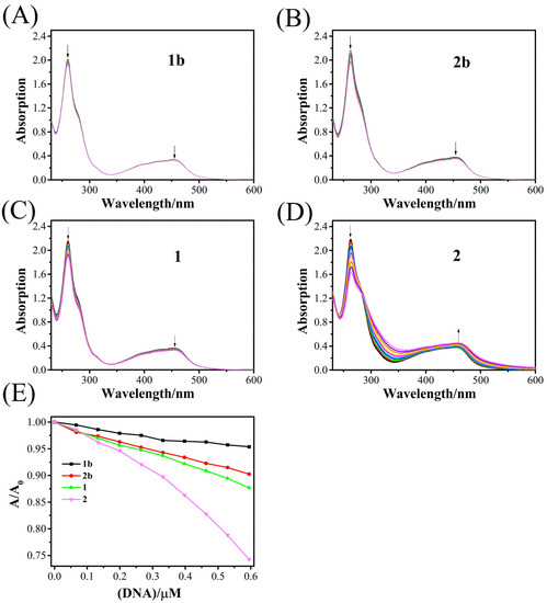 (A–D) Electronic spectra of 1b (A), 2b (B), 1 (C), and 2 (D) combined with c-myc G4 DNA in Tris-HCl-KCl buffer solution at pH 7.2. The arrow shows the change in absorbance intensity as the concentration of DNA increases. (E) The absorbance intensity of 1b, 2b, 1, and 2 with increasing concentrations of c-myc G4 DNA. ([Ru] = 20 μM, [c-myc G4 DNA] = 100 μM).