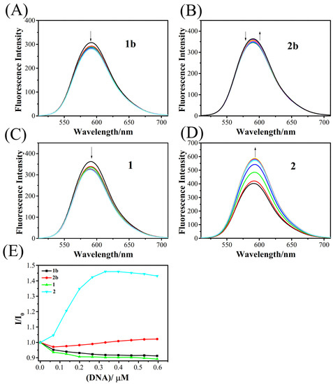 (A–D) Fluorescence emission spectra of 1b (A), 2b (B), 1 (C), and 2 (D) combined with c-myc G4 DNA in Tris-HCl-KCl buffer solution at pH 7.2. The arrow shows the change in emission intensity as the concentration of DNA increases. (E) The fluorescence intensity at 590 nm of 1b, 2b, 1, and 2 with increasing concentrations of c-myc G4 DNA. ([Ru] = 10 μM, [c-myc] = 0.067n, n = 0, 1, 2 ...).