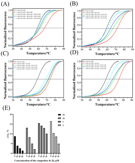 Melting FRET and competitive FRET results for 1b (A), 2b (B), 1 (C), and 2 (D) without and with 10-fold (2 μM), 20-fold (4 μM), or 40-fold (8 μM) excess of duplex DNA competitor (ds26) in 10 mM Tris-HCl (pH 7.4), 100 mM KCl, and 10 mM Na3AsO4. The concentration of c-myc G4 DNA was 0.2 μM. (E) The ΔTm values for 1b, 2b, 1, and 2 with 10-fold (2 μM), 20-fold (4 μM), or 40-fold (8 μM) excess of duplex DNA competitor (ds26).