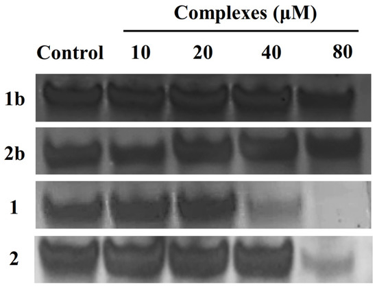 As seen in Figure 4, the CD spectra of the parallel G-quadruplex conformation-forming G4 DNA structure made from oligonucleotides pu22 had a positive peak at about 264 nm and a negative peak at approximately 243 nm [30,31]. No obvious spectral changes were seen in the CD spectrum with the addition of 1b and 1 ([c-myc]/[Ru] = 1:6), showing that the interaction between complexes and c-myc G4 DNA barely altered the G-quadruplex structure in a K+ solution. The spectra after the addition of 2b and 2 demonstrate that the binding of 2b and 2 resulted in a minor reduction in or enhancement of the positive band in a K+ solution at 265 nm. Additionally, a positive induced CD signal was seen in the 290–300 nm region as the concentration of complexes 2b and 2 increased. These findings suggested that 2b and 2 may connect to the c-myc G4 DNA via electrostatic interaction or straightforward groove binding.