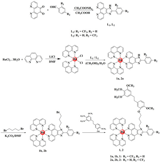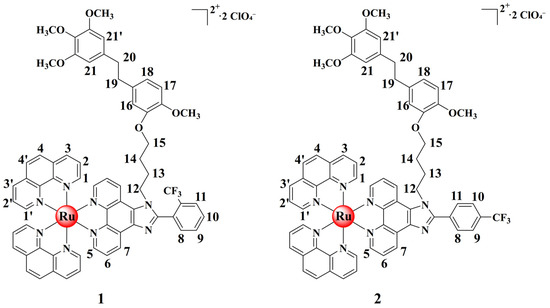 The targeted complexes were prepared according to Scheme 2. As usual, the target complexes 1–2 were obtained by heating the mixture of the intermediate 1b–2b and erianin under the irradiation of microwave at 90 °C for 30 min. Complexes 1b–2b was obtained by heating the mixture of 1a–2a, which was obtained by reflux Ru(phen)2Cl2.2H2O with corresponding ligand (L1 or L2) in the solvent of ethylene glycol, and 1,4-dibromobutane in DMF solution at 60 °C for 24 h. The chemical shifts of 1 and 2 in 1H NMR at 6.51 and 6.73 ppm can be attributed to the erianin benzene ring (Figure 1). The chemical shifts of 1 and 2 at 3.48, 3.57, and 3.70 ppm can be attributed to methoxy group on the erianin. For 1, the chemical shifts at 1.77, 1.97, 3.82, and 4.61 ppm can be attributed to the flexible chain of the compound. The chemical shifts at 7.66, 8.03, and 9.03 ppm can be attributed to H5, H6, and H7 in the phenanthroimidazole ligand, respectively. The chemical shift attributed to the phenanthroline ring appeared at 8.79, 8.41, 8.09, and 7.79 ppm. For 2, the chemical shifts at 7.94 and 8.13 ppm can be attributed to trifluoromethyl-benzene. In addition, the lipophilicity of these complexes was measured by an n-octanol/water partition coefficient (logPo/w) study (Figure S1). Two erianin-modified ruthenium(II) complexes 1 and 2 exhibited higher logPo/w values (−0.139 and −0.070, respectively) due to the lipophilic nature of their erianin group. In contrast, 1b and 2b observed lower logPo/w values (−0.869 and −0.71, respectively). These data imply that complexes 1 and 2 have higher lipophilicity than 1b and 2b. These results indicated that the introduction of erianin can improve the lipophilicity of ruthenium(II) complexes, making the lipophilicity of 1 and 2 higher than that of complexes 1b and 2b, which may contribute to the transmembrane uptake ability of ruthenium(II) complexes.