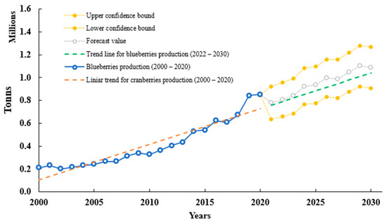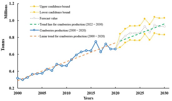 Cranberry (V. sect. Oxycoccus) is one of the most cultivated fruits in the U.S., with a global production of over 663.000 tons in 2020; this had a 108% increase from 2000 to 2020 (FAO). Based on the production and consumption of cranberry, this will also present a constant growth trend, with an increase of 44.4% (958107 tons) by 2030. In 2007, around USD 75 M was obtained from agricultural receipts [105]. In addition, considering the last 20 years of cranberry production and using Excel 2022 and FORECAST function, we predicted production until 2030 based on existing values that follow a seasonal trend. A confidence interval was estimated using interval values from 2000–2020. The interval was defined by its lower and upper bounds from 2020 until 2030. Seasonality was considered to be one decade. The confidence interval was expressed as a percentage (95%). The percentage reflects the confidence level. According to data analysis from FAO data, cranberries forecast may reach a value of 0.93 ± 0.14 M tons by 2030. Figure 2 shows a constant forecast and trendline that will increase in the following years.