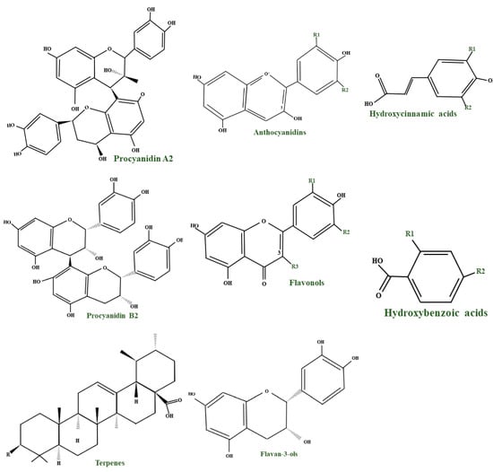 The most important bioactive compounds in cranberries are anthocyanins, flavonols, flavan–3–ols (catechins), PACs, benzoic and phenolic acids, nonflavonoid polyphenols (phloridzin), terpenes, sterols [106], and several essential micro- (Fe, Mn, Zn, Cu, Mo, B) and macro-elements (N, P, K, Ca, Mg, S), as evidenced in Table 3 [107].