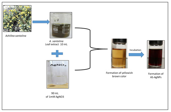 AgNO3 solution was prepared in deionized water and used for the biosynthesis of AS-AgNPs. In total, 10 mL of A. santolina leaf extract was added to 90 mL of 1 mM of AgNO3 and kept in a water bath at 90 °C for 60 min for the reduction process of silver ions [25]. The color change from colorless to dark brown denotes the biosynthesis of silver nanoparticles.