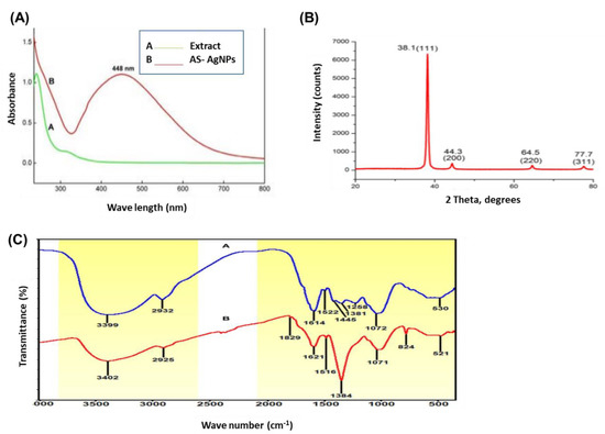 Verification of green biosynthesized AS-AgNPs. (A) UV–Vis spectrum of AS-AgNPs synthesized by A. santolina and A. santolina extract. The absorbance peak is at 448 nm, corresponding to the surface Plasmon resonance of AS-AgNPs (red line). Plant extract does not display any peak between 400 and 800 nm (green line). (B) The XRD spectrum of biosynthesized AS-AgNPs showed distinct diffraction peaks at 38.1°, 44.3°, 64.5°, 77.7°, and indexed at 2θ (degree) of (111), (200), (220), and (311) in face center cubic lattices. (C) FTIR spectrum of A. santolina extract: blue line, and AS-AgNPs synthesized by A. santolina: red line.