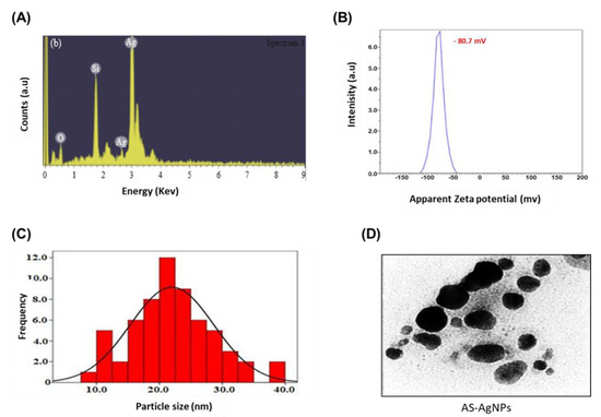 Characterization of green biosynthesized AS-AgNPs. (A) The EDX spectrum of silver nanoparticles synthesized by A. santolina showed a pattern of approximately 63.65% occurrence of Ag metal. (B) Zeta potential of silver nanoparticles synthesized by A. santolina. The value of zeta potential is −80.7 mV. This value displays the high stability of A. santolina extract to synthesize AS-AgNPs. (C) The size distribution histogram of the dynamic light scattering (DLS) analysis of the biosynthesized AS-AgNPs. According to DLS analysis, this size distribution of AS-AgNPs is centered at 21.9 nm. (D) TEM micrograph of AS-AgNPs biosynthesized from A. santolina leaf extract. AS-AgNPs appeared spherical in shape with an average size of 21.9 nm.