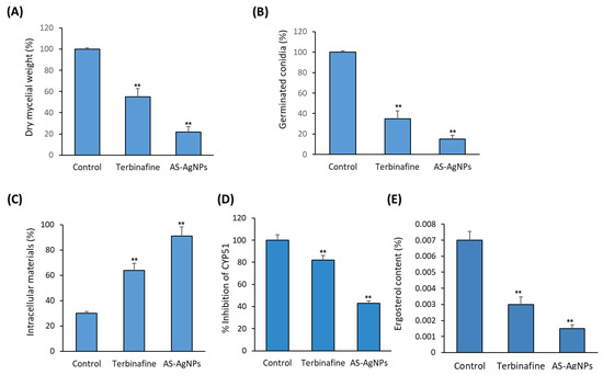 Effect of AS-AgNPs on mycelial growth and cell membrane integrity of T. rubrum. (A) Percentage of dry mycelial weight produced by T. rubrum in the absence (control) and presence of terbinafine (MIC: 256 μg/mL) and AS-AgNPs (MIC: 128 μg/mL). (B) Percentage of conidial germination of T. rubrum in the absence (control) and presence of terbinafine (256 μg/mL) and AS-AgNPs (128 μg/mL). (C) Rate of release of intracellular material from T. rubrum at 260 nm in the absence (control) and presence of terbinafinel (MIC: 256 μg/mL) and AS-AgNPs (MIC: 128 μg/mL). (D) Inhibition rate (%) of CYP51 enzyme in T. rubrum in the absence (control) and presence of terbinafinel (MIC: 256 μg/mL) and AS-AgNPs (MIC: 128 μg/mL). (E) Ergosterol content as percent of the wet weight of T. rubrum in the absence (control) and presence of terbinafinel (MIC: 256 μg/mL) and AS-AgNPs (MIC: 128 μg/mL). Values are mean ± SD of three independent experiments (** p < 0.05 compared to control non-treated cells).