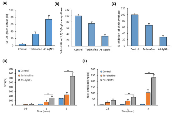 In vitro mechanistic studies of antifungal action of AS-AgNPs against T. rubrum. (A) Effect of AS-AgNPs (128 μg/mL) on SYTOX® Green uptake into T. rubrum after 24 h of treatment. (B) % Inhibition of β-(1,3)-d-glucan synthase in the absence or presence of AS-AgNPs (128 μg/mL) against. T. rubrum. (C) % Inhibition of chitin synthase in the absence or presence of AS-AgNPs (128 μg/mL) against T. rubrum. (D) Effect of AS-AgNPs (128 μg/mL) on ROS release from T. rubrum after treatments of different durations. (E) Effect of AS-AgNPs (128 μg/mL) on the nick-end labeling of T. rubrum after treatments of different durations. Values are mean ± SD of three independent experiments (* p < 0.05, ** p < 0.05 compared to control non-treated cells).