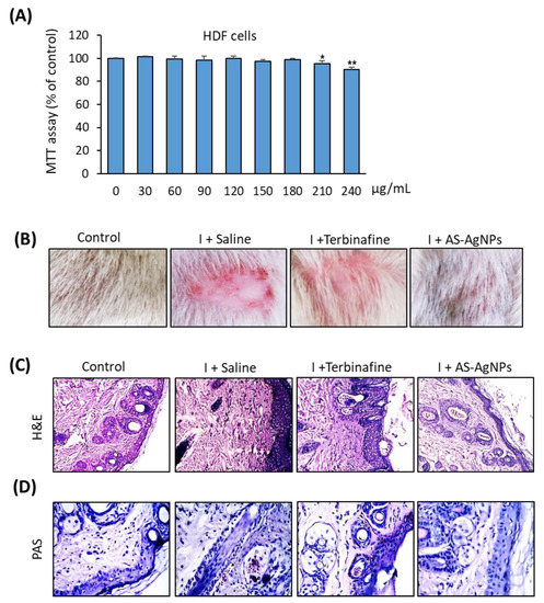 Skin histological analysis of rat dermatophytosis model. (A) Cytotoxicity of AS-AgNPs on primary HDF cells. Cell viability was measured by MTT assay after 48 h of incubation at different concentrations of AS-AgNPs. Values are mean ± SD of three independent experiments (* p < 0.05, ** p < 0.05 compared to control non-treated cells). (B) Representative images of infected skin tissue taken on day 14 post treatment. Groups are as follows: control (non-infected), I + Control (infected rat with saline treatment), I + Terbinafine (infected rat treated with terbinafine (10 mg/kg) and I + AS-AgNPs (infected rat treated with AS-AgNPs (0.5 μg/g)). Skin tissue sections stained with H&E (C) and periodic acid–Schiff (PAS) (D). I + Terbinafine displayed slight effect on thickness of epidermis of skin, and fungal fragments were still identified in the epidermis and the hair follicle (PAS). The AS-AgNP-treated group showed complete recovery of skin structure (H&E) with an absence of fungal cells.