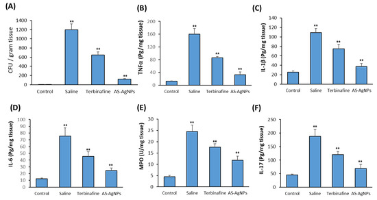 Effect of AS-NPs on fungal burden and dermal pro-inflammatory cytokines in dermatophytosis rat model. (A) Inhibitory effect of AS-AgNPs versus trebinafine treatment on colonization of T. rubrum in infected skin homogenate after 14 days of treatment. Infected rats with T. rubrum were treated for 14 days with saline, terbinafine (10 mg/kg) or topically with AS-AgNPs (0.5 μg/g. Effect of AS-AgNPs versus trebinafine treatment on the pro-inflammatory cytokines produced in the infected skin tissues of the dermatophytosis rat model. The following cytokines, including (B) TNF-α, (C) IL-1β, (D) IL-6, (E) MOP and (F) IL-17, were measured as described in M&M. Values are expressed as means ± SD (n = 6 rats/group) (** p < 0.005, compared to control non-infected cells).